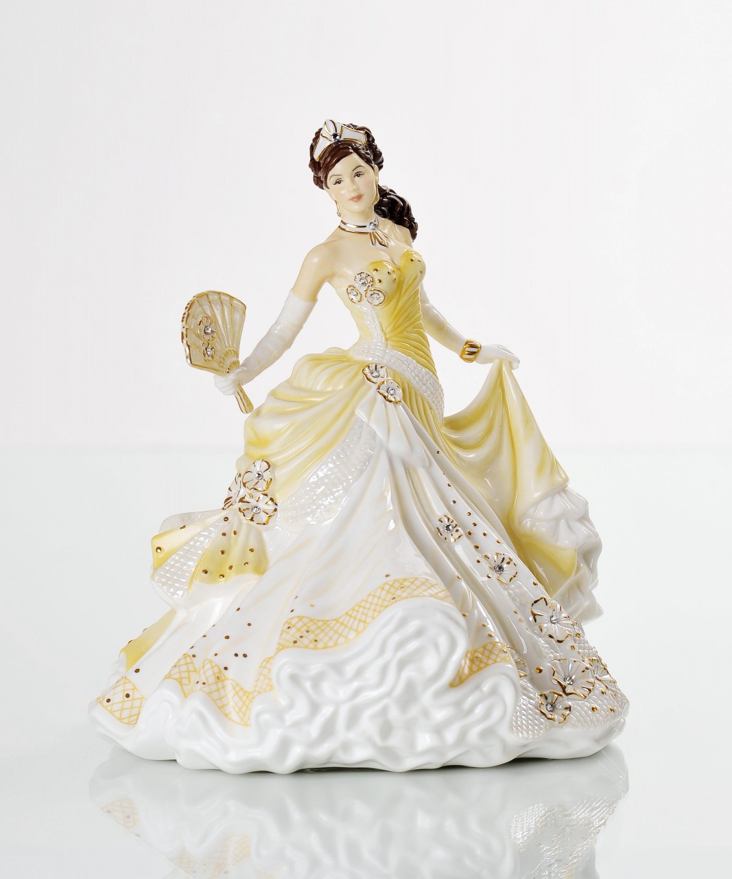 Her dress is painted in a beautiful sunshine yellow colour that is brought to life with the real gold highlights and Mother of Pearl lustre. Flowing down her dress are 37 Swarovski crystals that catch the light making her sparkle elegantly.